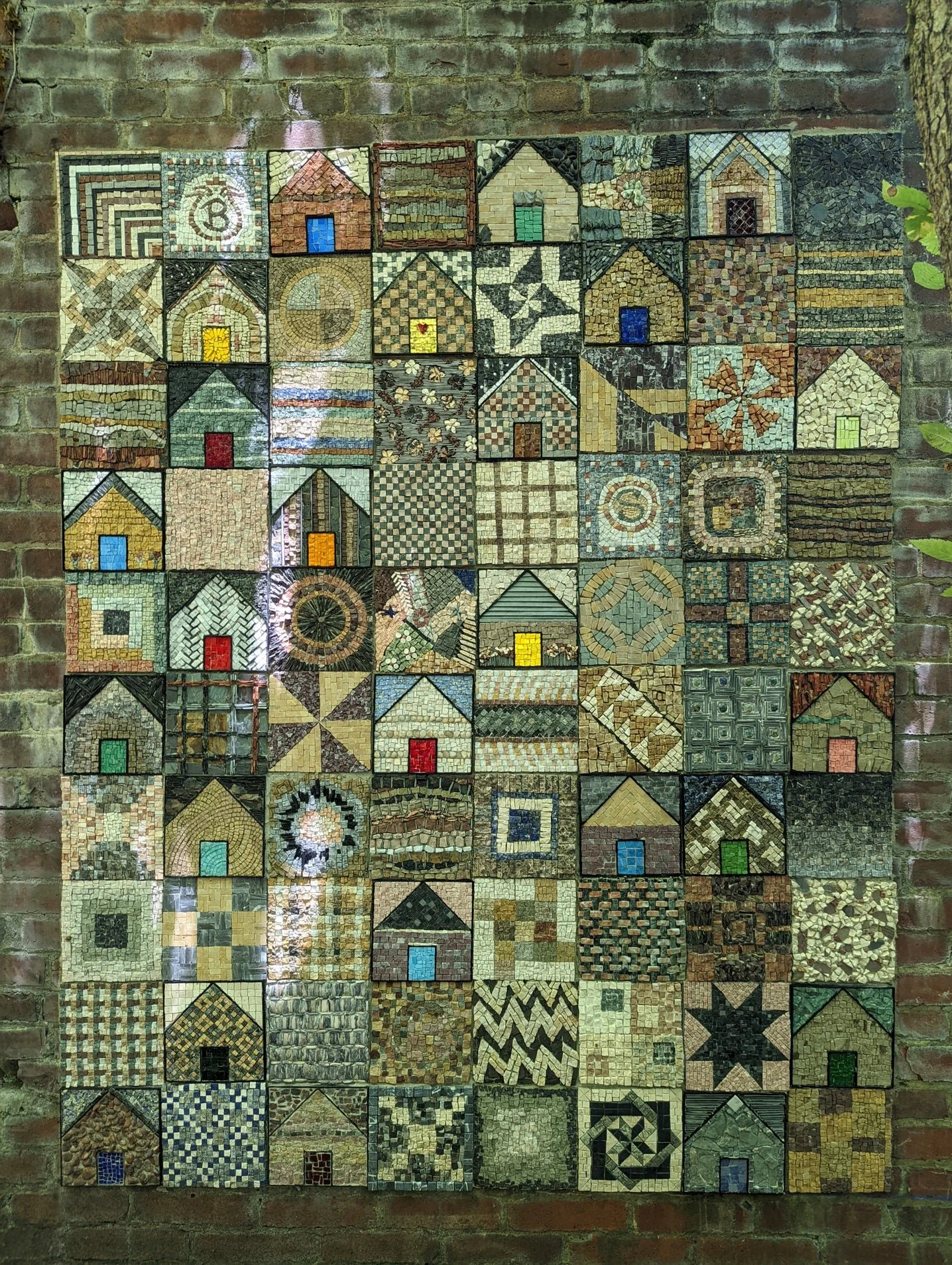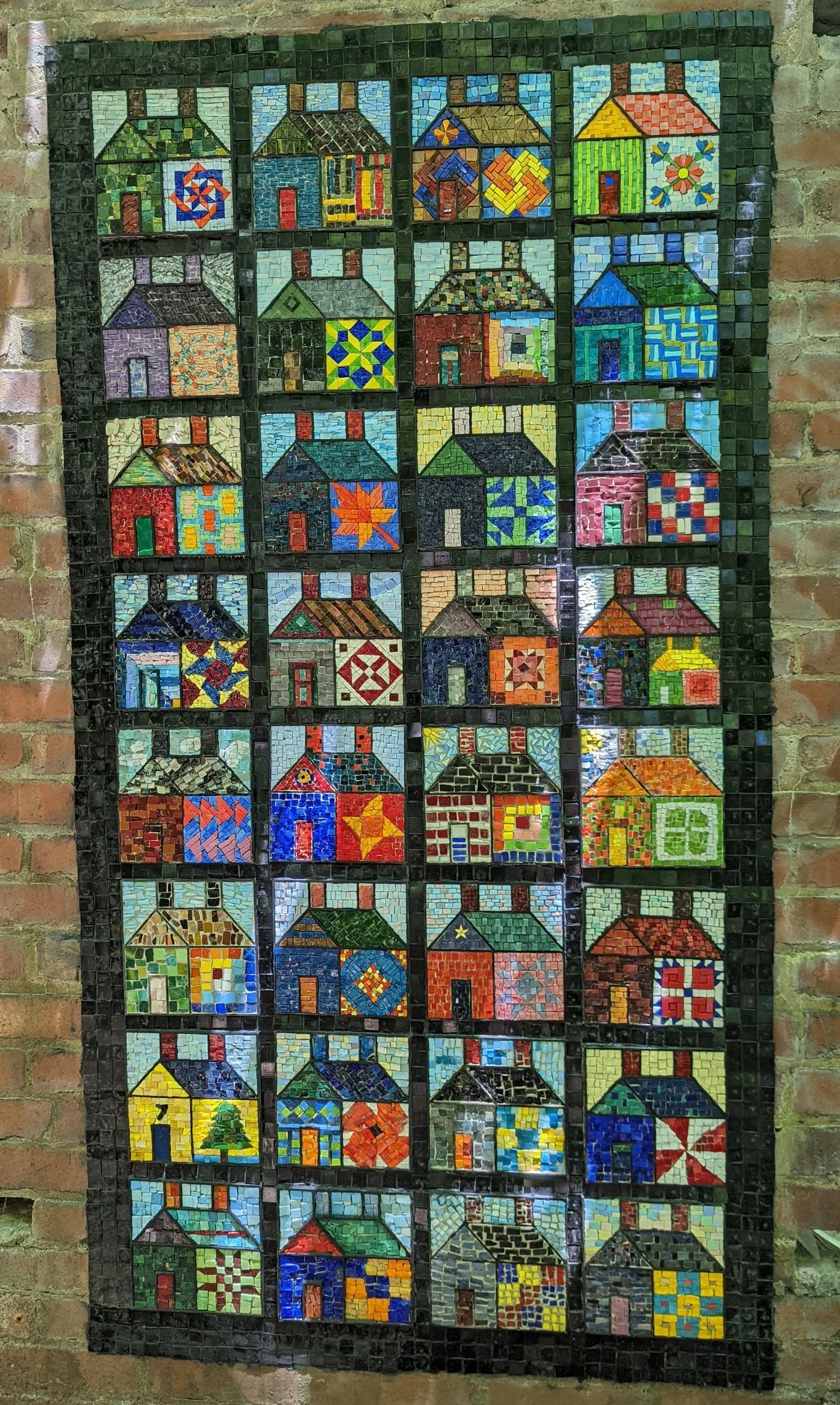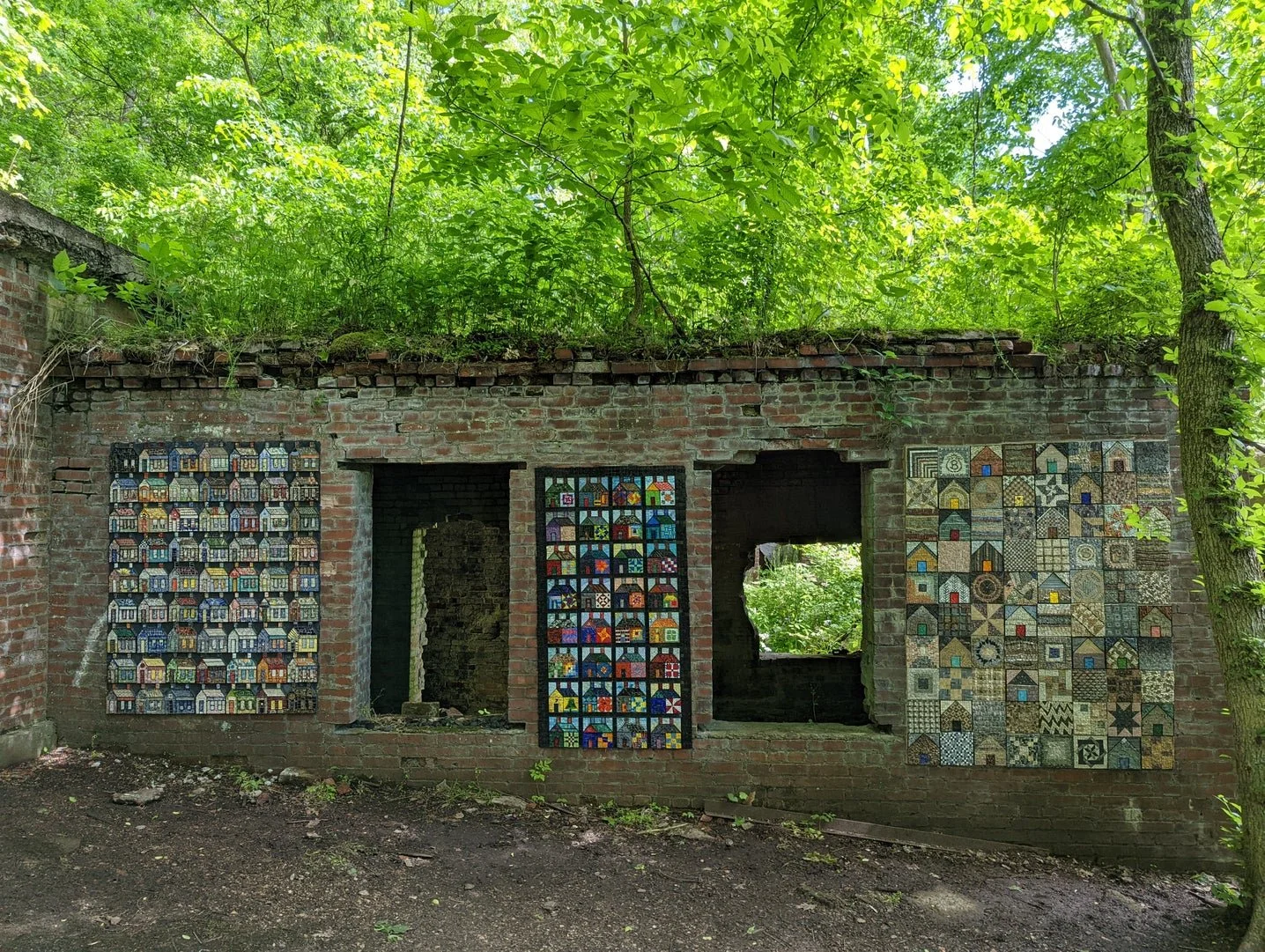 The quilt, that most American of art forms, was our template for pulling you into a niche in time. Each coal company house may have been a cookie-cutter of its neighbor, but inside was a family, as diverse as the artists who bring their art to The Ruins. The Quilt Artists used their unique skills to represent the vibrancy locked inside the sameness of the patch house. The block frames followed a predetermined design and then each artist's block was installed to build three, veryquilt-ish compositions.From patterns like flying geese, nine patches, log cabins and even a Gees Bend inspired house tograndmother's china and heirloom plates to Scottish tartan and houndstooth fabric houses.These talented artists dove into the deep end ofquilt-ishness Enjoy perusing the photos and have fun matching the artist to the house. You can match each name to each house by their corresponding number/letter identifications.